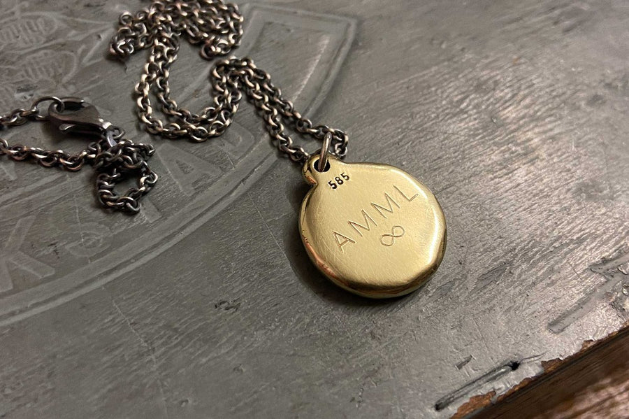 Solid 14ct Gold charm with an embossed antique Madonna badge on a short or long necklace. We embossed the pendant from a vintage die which was elaborately hand engraved around 1905 in Pforzheim, Germany. We collect these steel tools and have around 700.